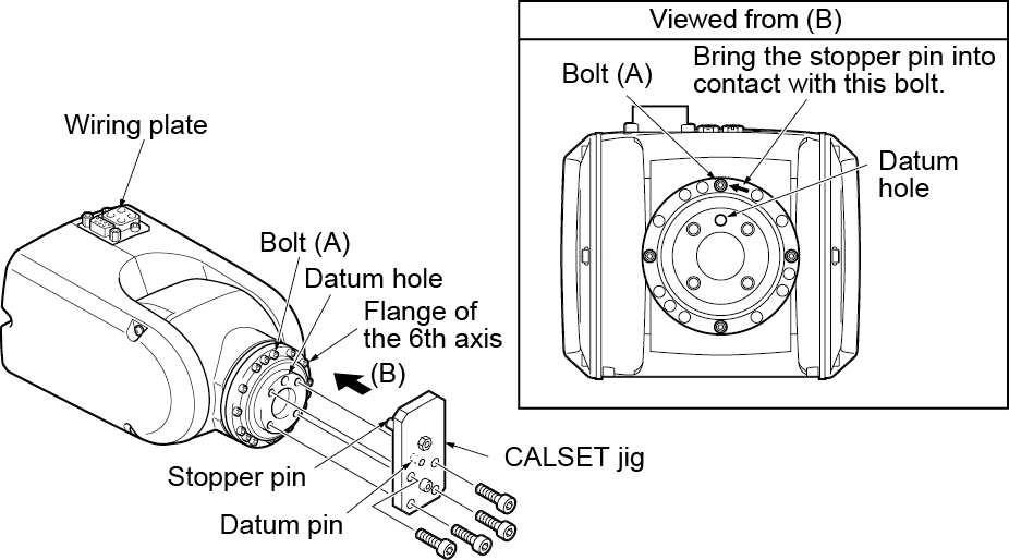The CALSET position of the 6th axis refers to the point where the stopper pin (shown in the figure below) comes into contact with bolt (A) by turning the flange of the 6th axis.