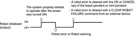 - The signal will be turned ON when a robot error is cleared by the CANCEL key of the teach pendant, mini-pendant or by Clear Robot Error, after the power is turned OFF.