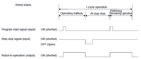 - If the state of this signal is changed from ON (shorted) to OFF (open), the robot will stop all tasks as soon as the ongoing step is completed, and the Robot-in-operation signal will be turned OFF. However, auto mode or external mode will remain valid, and the suspended program will be resumed by inputting a program operation command (start). See the figure given below.