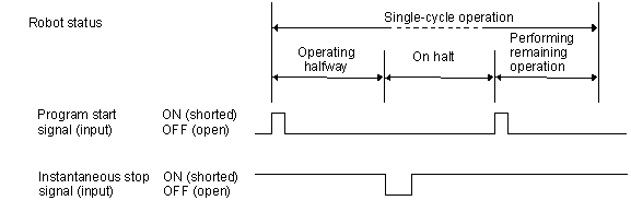 If the program start signal is input (switched from OFF to ON) when the robot has not yet completed the program or is at rest after it has completed a cycle of the program, the program No. select signal will be read, the program will execute a cycle, and the robot will come to a stop.