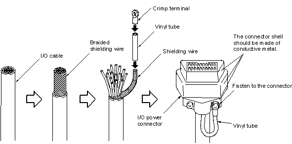 Be sure to modify the shielding wire at the end of the cable to be used, as shown below. Without this modification, the robot may malfunction due to noise.