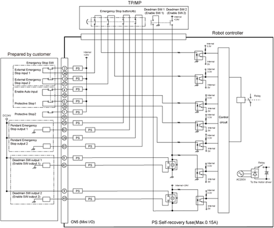 The internal relay receives the External Emergency Stop input signal and the emergency stop input from the teach pendant to output this signal. When the power is turned OFF, the controller is in the emergency stop state.