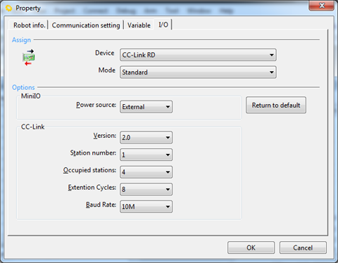 From the [Project] menu, point to [Property] to open the Property window, and then click .[I/O] tab. For details, refer to "Configuring a Project".