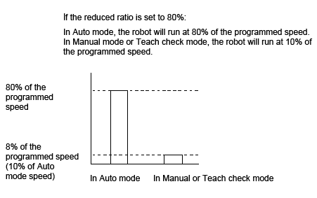 In Manual mode or Teach check mode, the robot controller is designed to run the robot at 10% of the programmed speed. If the reduced ratio is 80%, therefore, the robot will run at 10% x 80% of the programmed speed, that is, at 8%, as shown in the figure below.