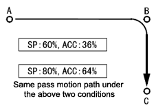 If the robot executes a pass motion by using the automatically set acceleration, its motion path is always constant. The figure below shows an example when the speed is set to 60% and 80%.