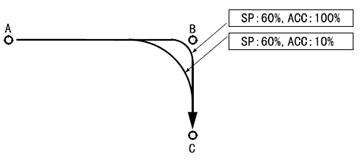 If arbitrary acceleration is set, the motion path may change. The figure below shows an example of 60% speed with both 100% and 10% acceleration and deceleration.