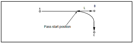 In the following case, even if the pass start displacement is designated with "@ numeric value," the pass motion starts from the position which is less than the position of numeric value = L (mm).