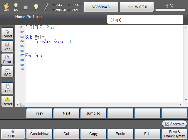 Save the program. Press [Save] to display the change confirmation dialog, and then press [OK] to save it. Error message will be displayed if there is syntax error when saving the program. Correct the error, and save the program again. |