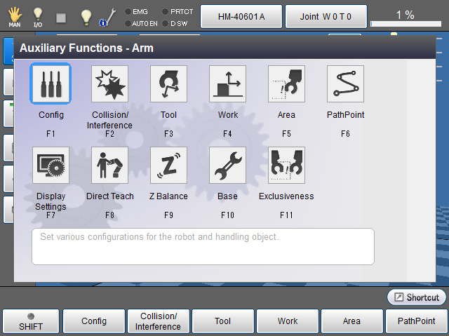 Display the menu to set various configurations required to move robot, "Tool coordinates" and "Work coordinates", and "Area","PathPoint".