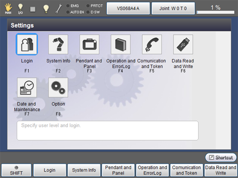 | [F3 Pendant and Panel] | Perform settings associated with display including language and character size, and set the panel. |