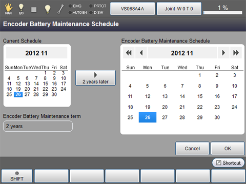 Press [Setting] by directly touching the screen of teach pendant to set the next Encoder Battery maintenance date. Press [OK] in [Encoder Battery Maintenance Schedule] window to confirm the next maintenance date.
