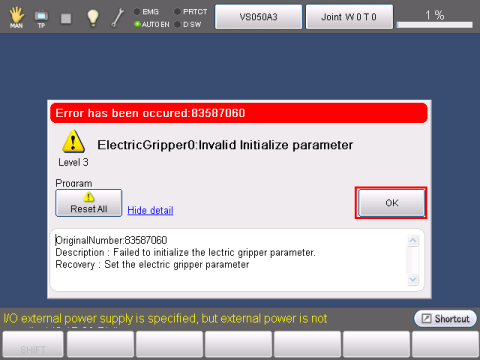 When rebooting the robot controller, an error message shown below appears. Press [OK] to close the error. This error will not appear if the electric gripper was used in the same project.