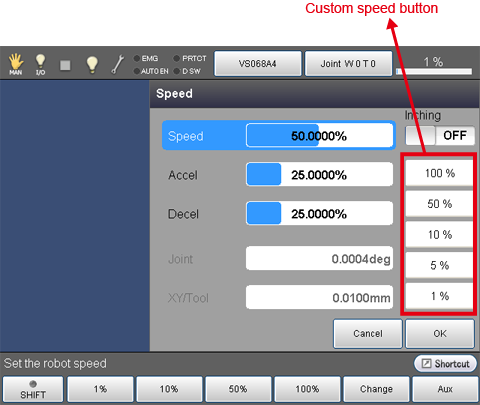 Press [SPEED] key on the teach pendant to display the following [Speed] window.