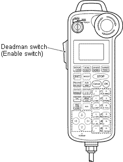 The teach pendant and mini-pendant have a deadman switch(es) each. Holding down the deadman switch properly activates some functions in Manual mode or Teach check mode.