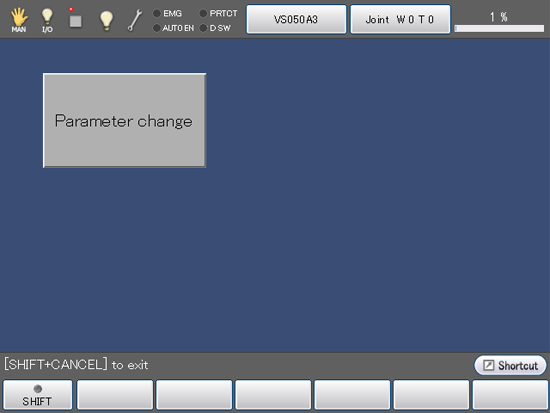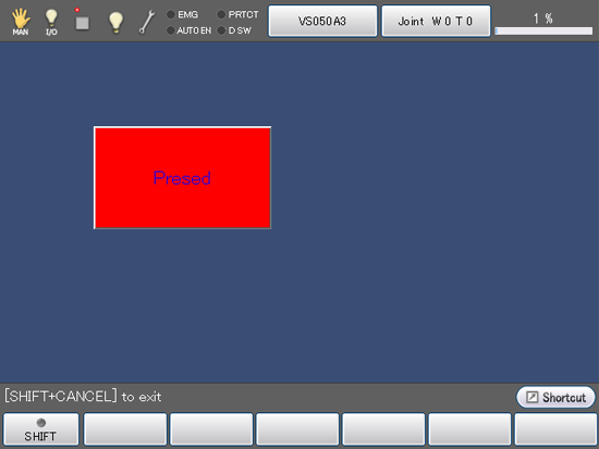 The following example illustrates the procedure for creating two buttons: one (labeled "I/O operation") that turns I/O variable #24 on as long as it is pressed and another (labeled "Program_run") that runs a program (Sample pro).
