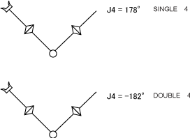 The robot can take two different 4th-axis figures--SINGLE 4 and DOUBLE 4. If the 4th axis rotates by -180°<θ4≤180° in mechanical interface coordinates, the figure is SINGLE 4; if it rotates by 180°<θ≤185° or -185°<θ≤-180°, the figure is DOUBLE 4.