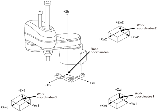 Base coordinates are 3-dimensional Cartesian coordinates with its origin at the center of the robot base. It has components Xb, Yb, and Zb which are identical with X, Y, and Z in X-Y mode.
