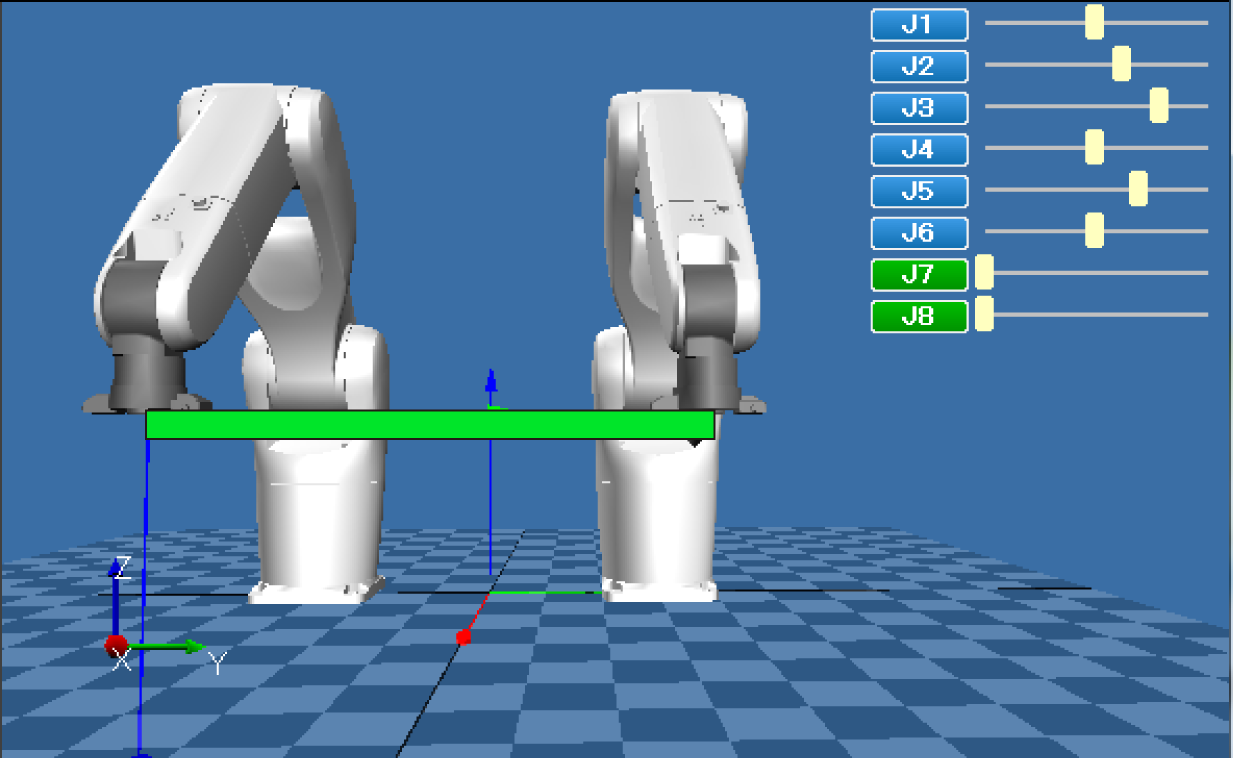 Assuming that two robots move a plate-shaped workpiece together. Robots tilt the workpiece at transporting.
