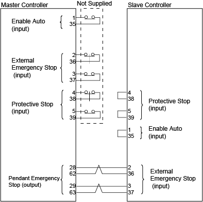 | Emergency Stop | Slave controller stops when this signal is opened. | Link the slave to the master |
