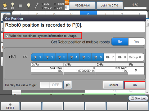 If you want to write the coordinate system information (robot number, work number, and tool number) into the Usage column, select the check box of "Write the coordinate system information to Usage".