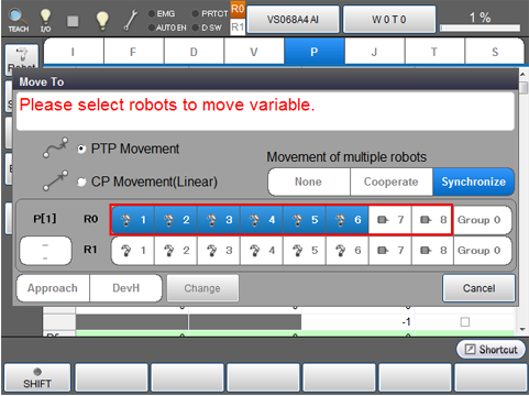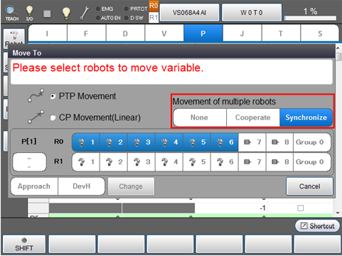 When you press "DevH", a dialog box appears. Enter given coordinate values (X, Y, Z, Rx, Ry, and Rz) and press OK. All robots will offset by specified distances from the position specified by variable.