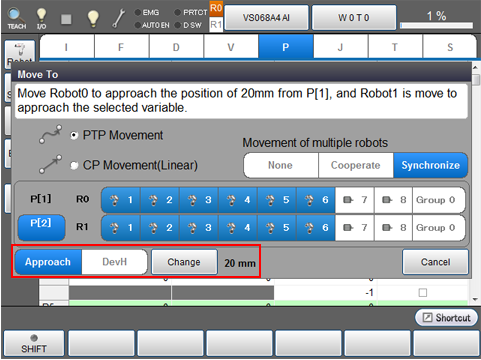 When you press "Approach" on the "Move To" window, a dialog box appears. Enter given approach and press OK. All robots will move to the position apart by the specified approach distance.