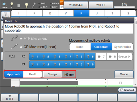 When you press "Approach" on the "Move To" window, a dialog box appears. Enter given approach distance and press OK. The leader robot will move to the position apart by the specified approach distance.
