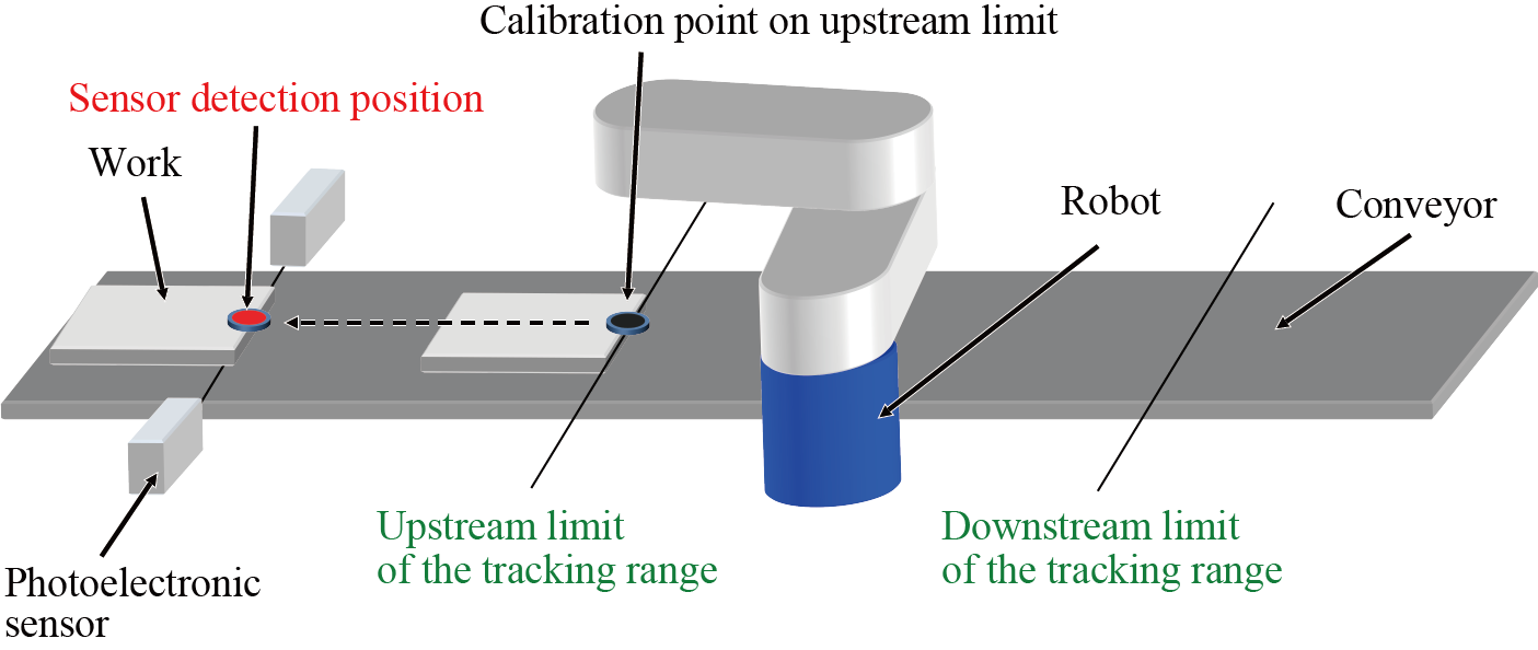 - This is the tracking limit on the upstream of the conveyor. Once a workpiece passes this limit, a robot starts the conveyor catch-up motion.