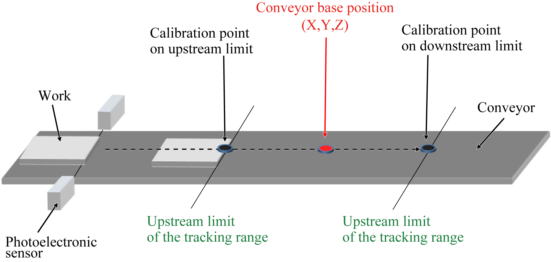 - In the conveyor tracking of RC8, conveyor calibration means measuring the exact positional relationship between the conveyor and robot. Specifically, it means measuring the following parameters.