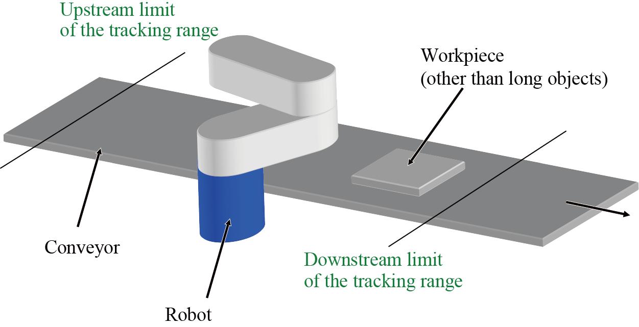 If the workpiece moves across the downstream limit of the tracking range before executing this command, an error will be issued.