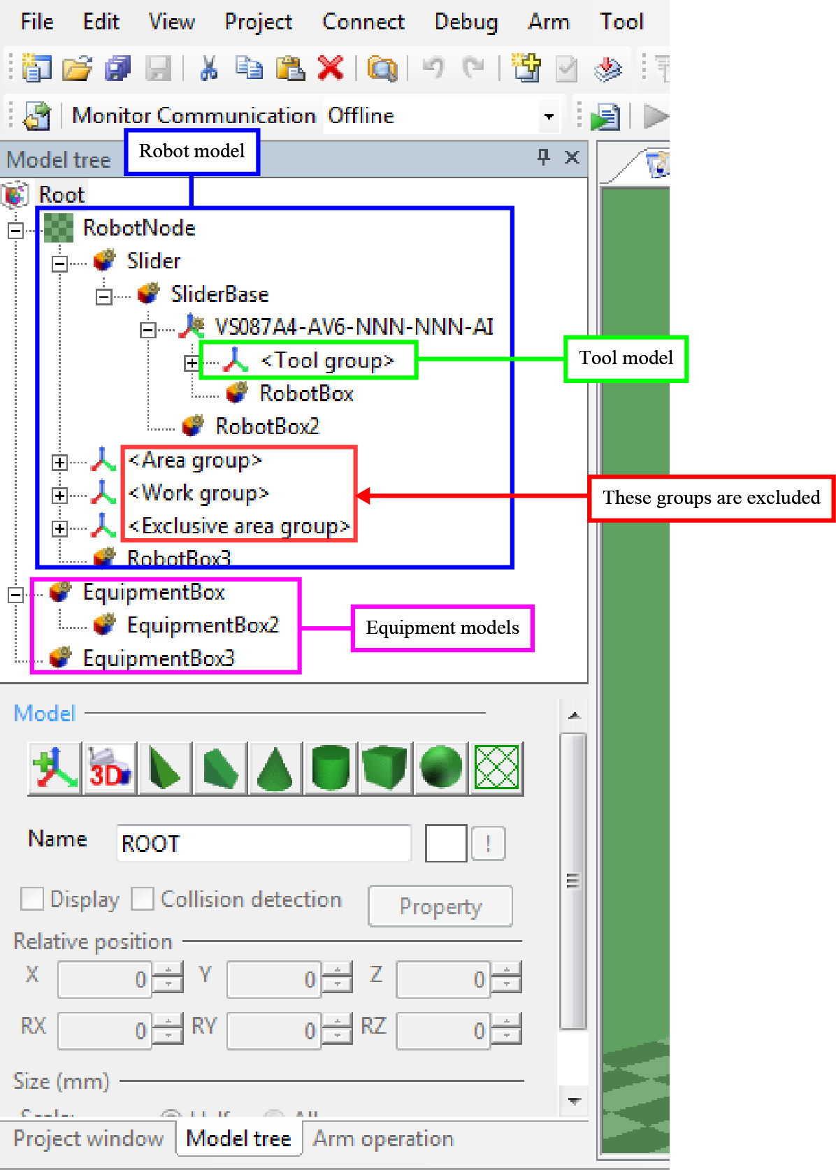 Objects that exist below the Robot node. Tool group, Area group, Work group, and Exclusive area group are excluded. |
