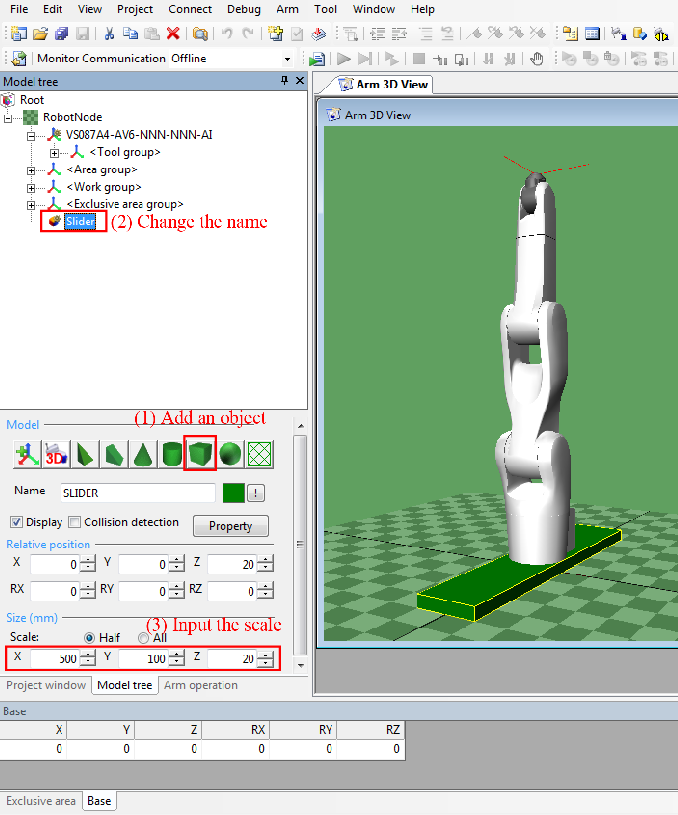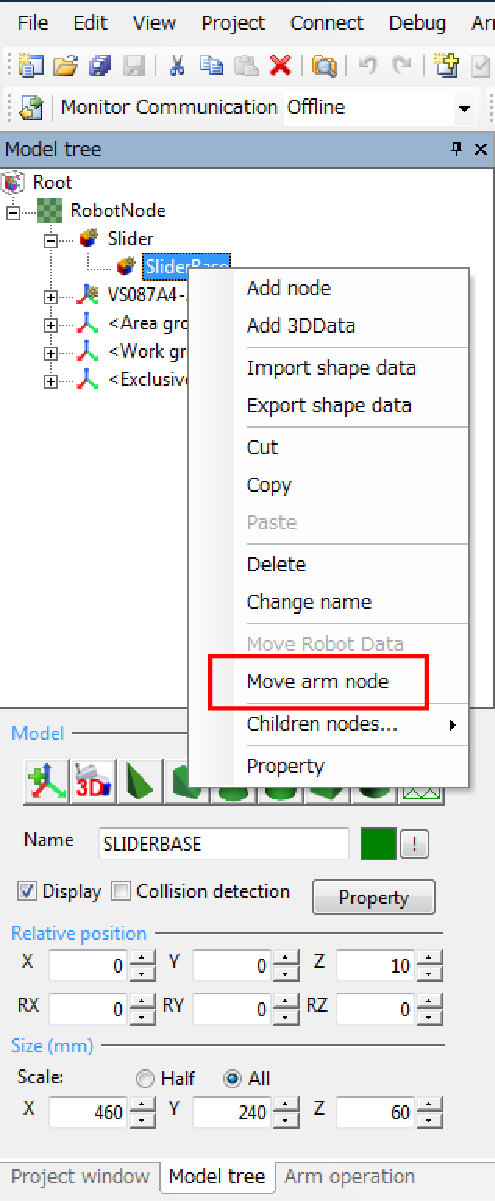 Press [Move arm node] to move the robot model to below the SliderBase.