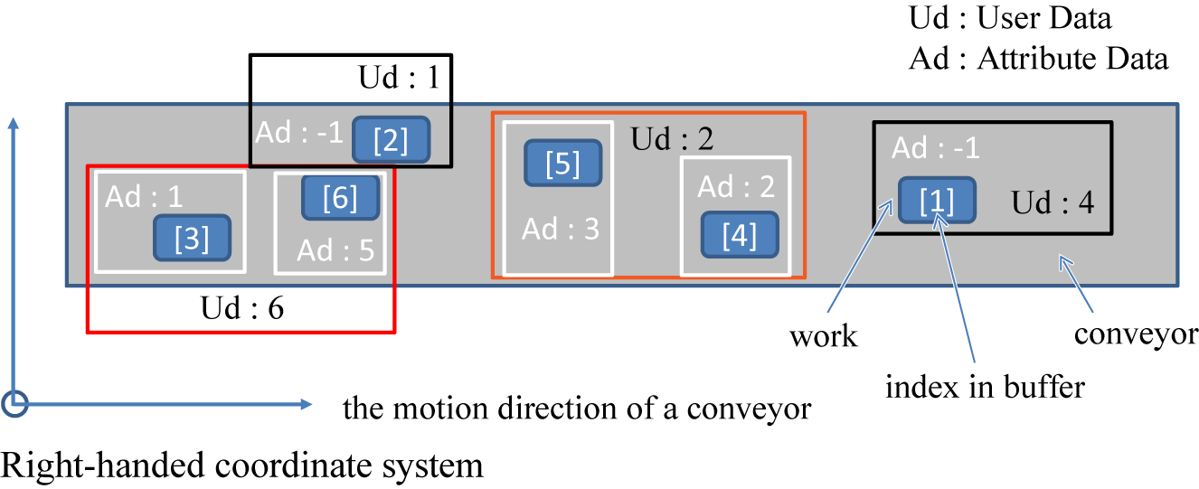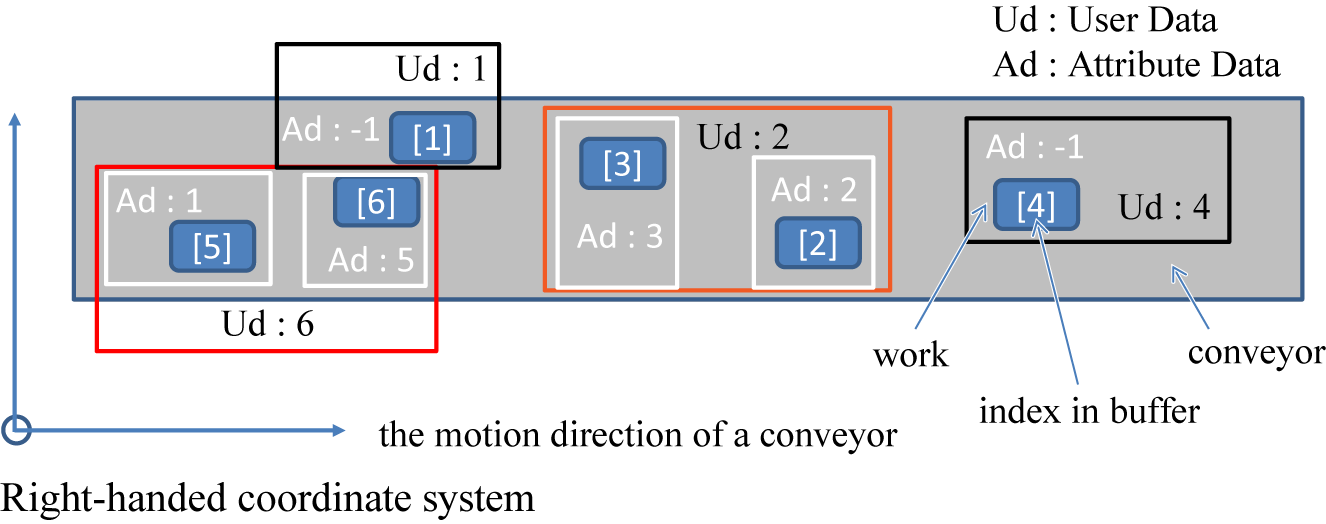 All data within the conveyor tracking buffer are sorted in descending order of attribute data.Setting value First sorting method Second sorting method 10 Workpieces are sorted in ascending order of user data. Workpieces are sorted in ascending order of attribute data.