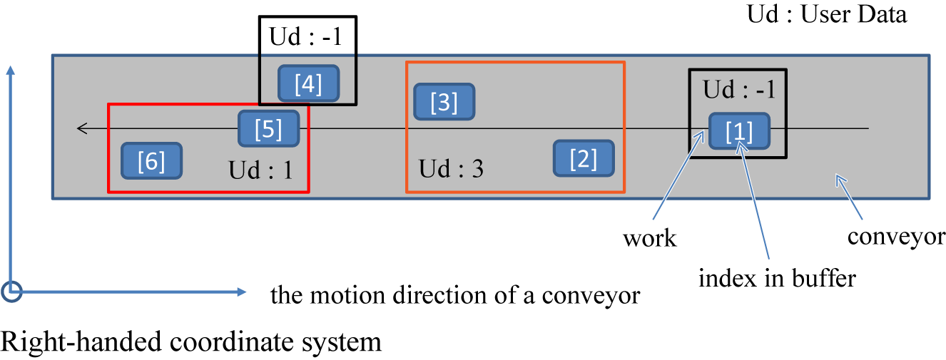 All workpieces within the conveyor tracking buffer are sorted in order from the left to the motion direction of the conveyor.Setting value First sorting method Second sorting method 4 Workpieces are sorted in ascending order of user data. Workpieces are sorted in order from the upstream.