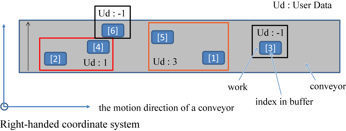 All workpieces within the conveyor tracking buffer are sorted in order from the upstream.Setting value First sorting method Second sorting method 6 Workpieces are sorted in ascending order of user data. Workpieces are sorted in order from the right to the motion direction of the conveyor.