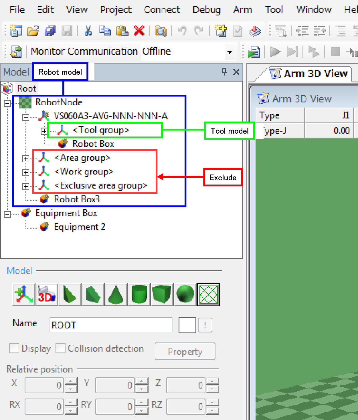 Robot model Objects that exist below the Robot node. Tool group, Area group, Work group, and Exclusive area group are excluded. -