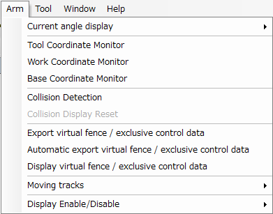 This submenu controls display of elements in the Arm 3D view window: floor, arm, tool, work, area, and obstacles.