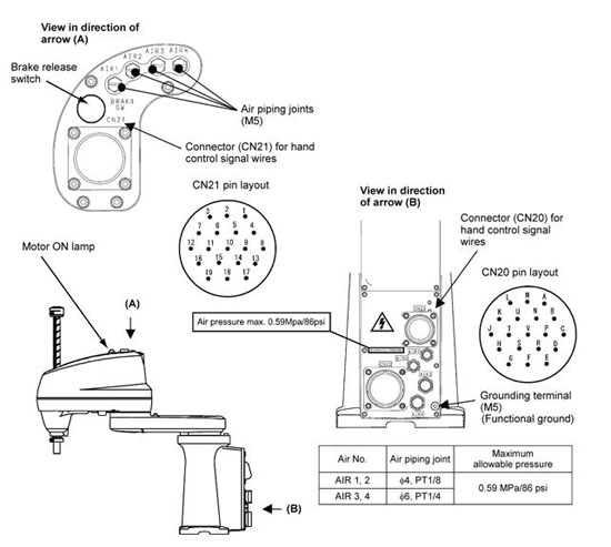 Note 1: Pins A to V on CN20 and pins #1 to #19 on CN21 are connected with each other as shown below. The maximum rated current per line is 1A.