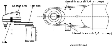 When mounting a stay that clamps wiring and piping to the robot unit, be sure to secure it with at least two screws using the four existing internal threads provided in the underside of the second arm.