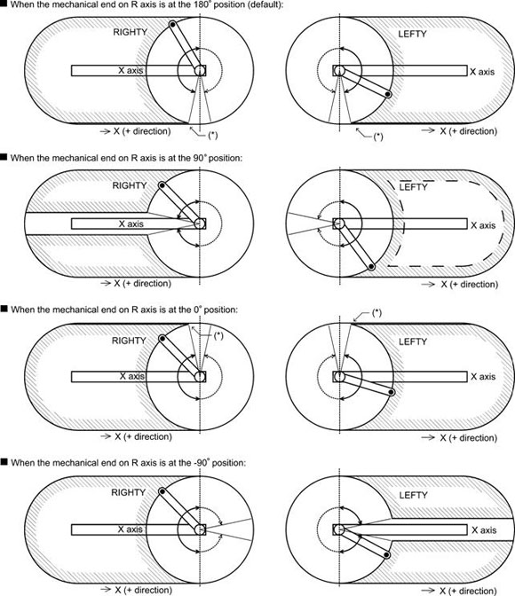 The restricted space of each figure differs depending upon the mechanical end position on the R axis.