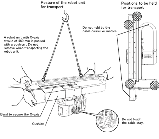 A robot unit with X-axis stroke of 450 mm is packed with a cushion . Do not remove when transporting the robot unit.