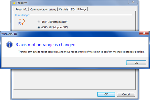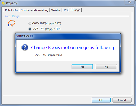 The following confirmation message appears since the R-axis motion range data held in the robot controller is different from the one specified in WINCAPSIII.