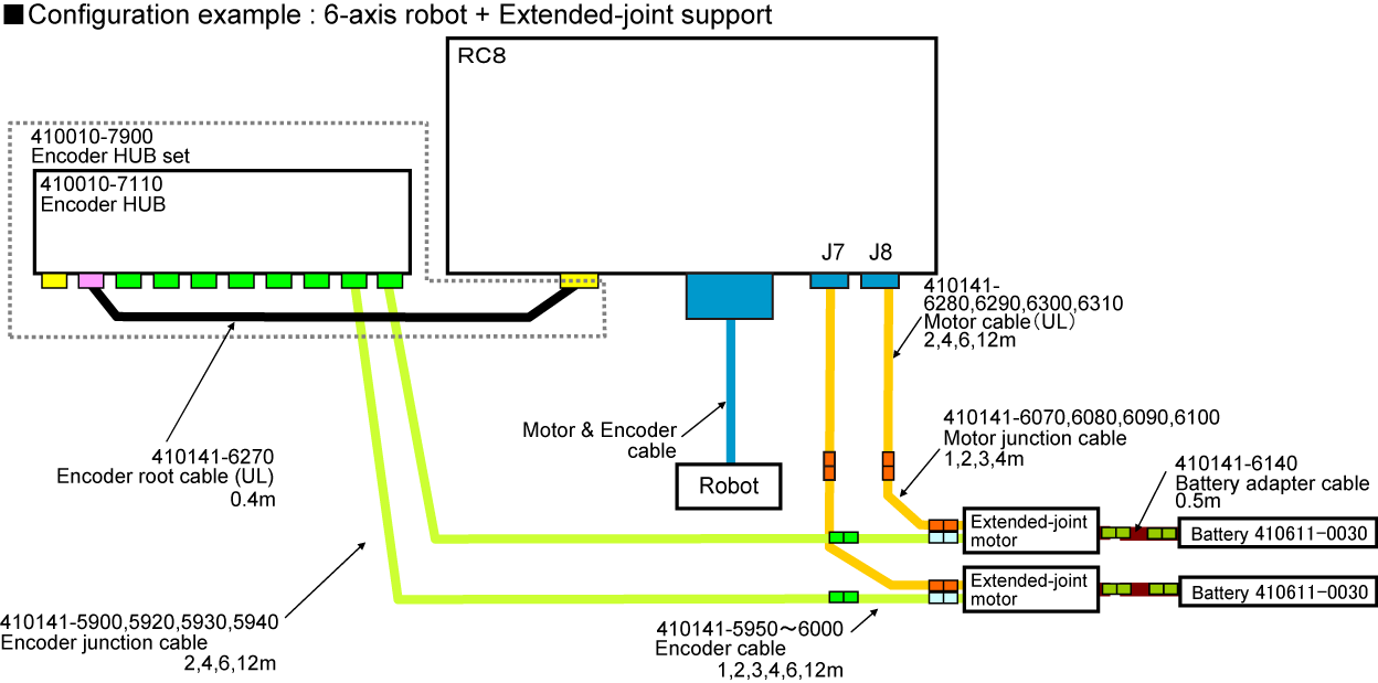 • The total length of an encoder cable for each axis between a connection port of the encoder hub and a connection port of the motor shall be 16meter or less. The total length of a motor cable of each axis between a connection port of the controller and a connection port of the motor shall be 16meter or less. The total length of all axes on the Extended-joint is 48m. The maximum length of the Motor & Encoder cable is 12m.