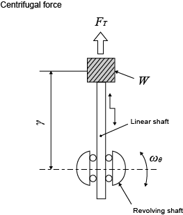 On an object (W) on the revolving shaft, centrifugal force (FT) occurs from center to outside in proportion to the square of revolving shaft angular speed (ωθ) and the revolving radius (r).