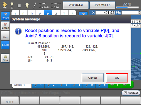 When you obtain the target position with a teach pendant, setting the same variable number for P-type variable (robot joints) and J-type variable (extended-joints) will enable you to obtain the both variable values at the same time.