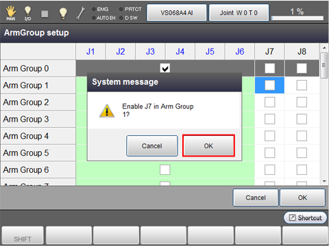 After all arm group settings are completed, press [OK] of the arm group setting window.