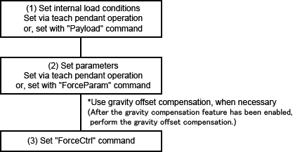When "ForceCtrl" is executed, the torque at stationary state of the robot and the gravity offset torque are compared, and any error between the two values will be corrected. Executing "ForceCtrl" may generate an error in the compensation value including when an external force such as a contact is applied to the robot. Run the "ForceCtrl" command with no external force exerted on the robot (except for gravity). To enable the force limiting function while any external force is applied, After the gravity compensation has been enabled by "GrvCtrl" command, use the "GrvOffset" command.