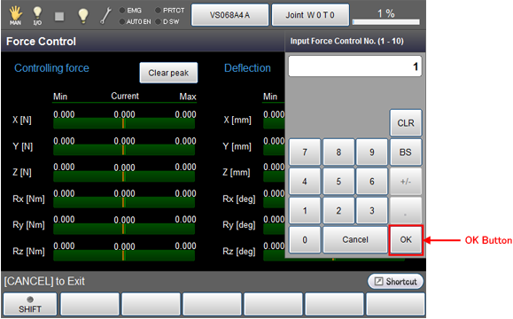 From the top screen, press [F2 Arm] - [F2 Force Control].