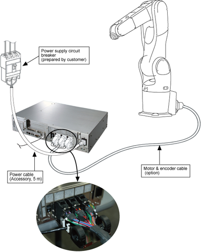 Use the power cable (5 m) that comes with the robot system as standard for supplying power to the controller. Connect the robot unit to the controller using an optional motor & encoder cable (selectable from 2 m, 4 m, 6 m, 12 m or 20 m).