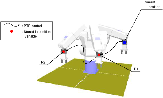 In the example shown below, the robot arm moves from the current position to P2 via P1 under PTP control.